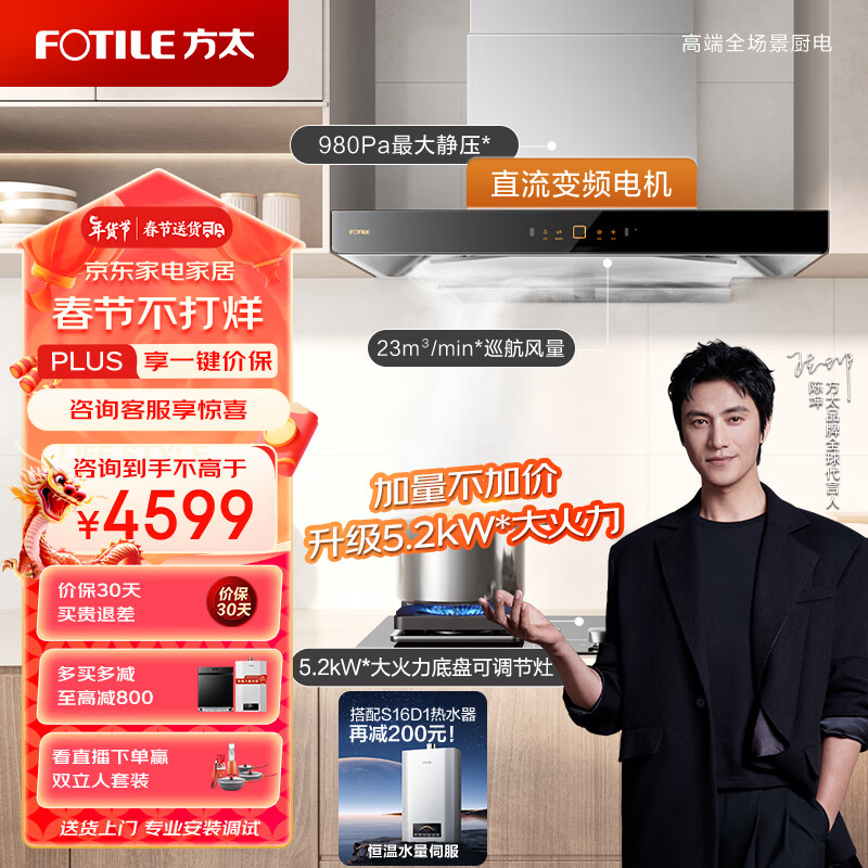 方太(FOTILE)抽吸油烟机燃气灶套装 欧式顶吸脱排烟机灶具套餐 直流变频23巡航风量02-EMD22T+02-TH27B天然气价格:4598.00元!