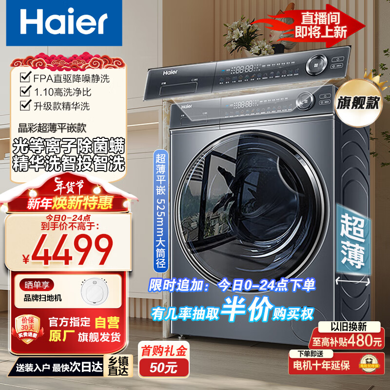 海尔(Haier)洗衣机直驱精华洗滚筒全自动家用 10公斤525超大筒径超薄平嵌一键智洗 光等离子除菌高清晶彩屏价格:4499.00元!