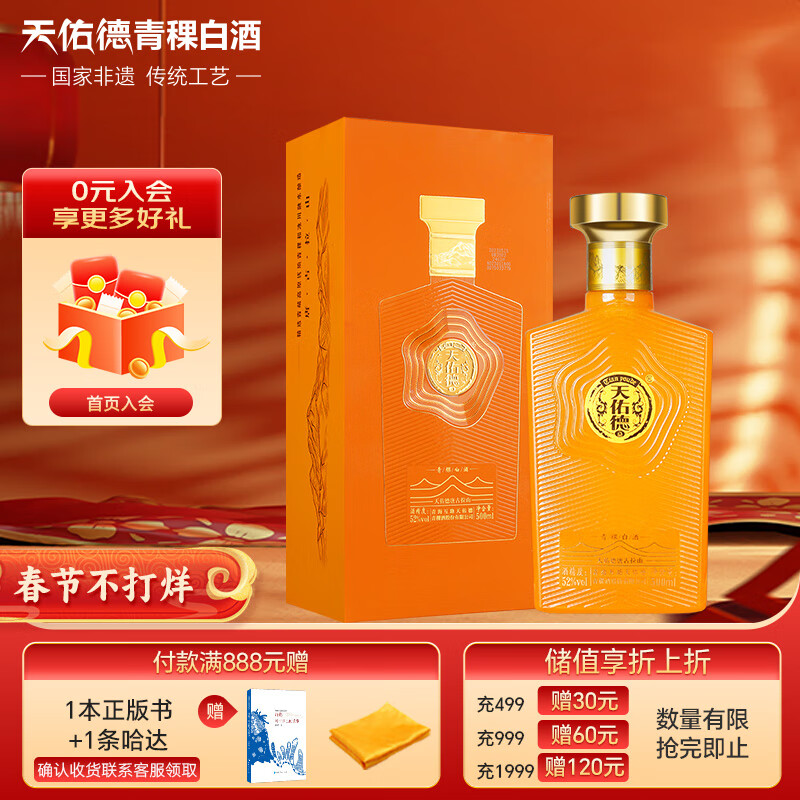 天佑德海拔唐古拉山52度 有机 清香型白酒 500ml单瓶装【年货送礼】价格:358.00元!