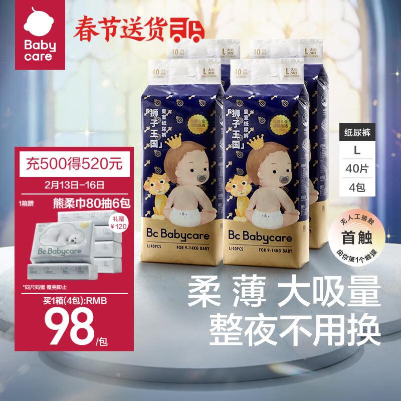 babycare皇室狮子王国纸尿裤婴儿尿不湿弱酸亲肤箱装L40片*4包 (9-14kg)价格:512.00元!