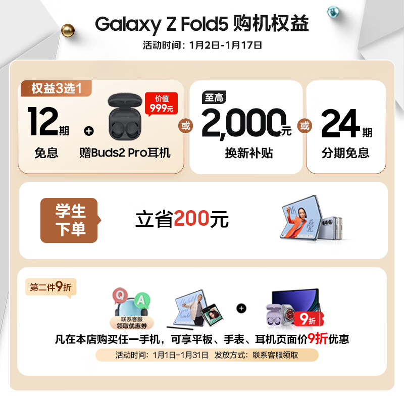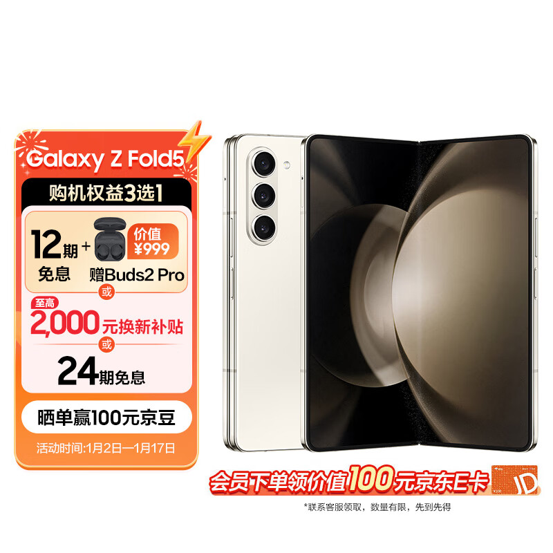 三星 SAMSUNG Galaxy Z Fold5 超闭合折叠 IPX8级防水 5G折叠手机 12GB+1TB 星河白价格:14999.00元!