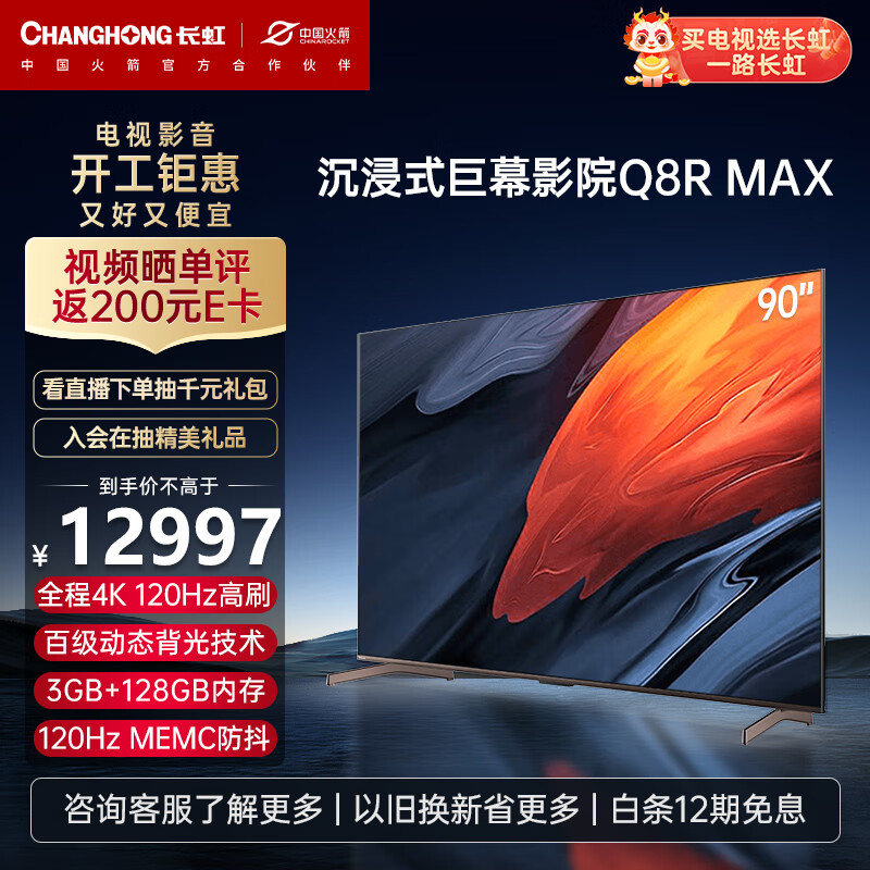 长虹电视90Q8R MAX?90英寸全程120Hz 分区背光 杜比音画?3+128GB超大存储?智能平板液晶LED电视机价格:12997.00元!