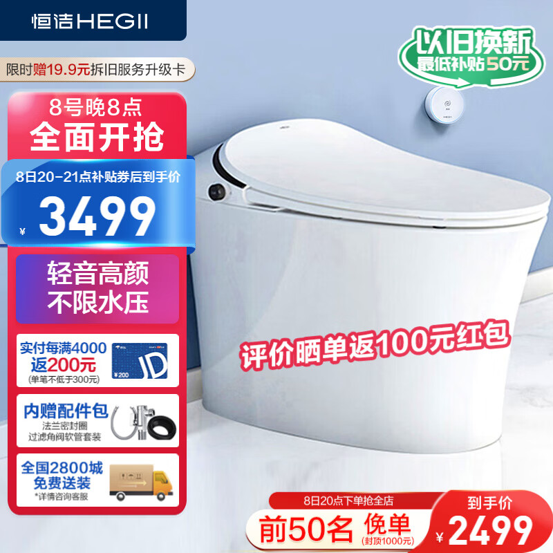 恒洁(HEGII)智能马桶一体机Qs2 适用低水压即热坐便器HCE827A01(坑距400mm)价格:3799.00元!