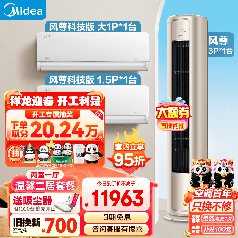 美的(Midea)空调 风尊系列 温馨二居套餐 两室一厅套装(1.5匹风尊科技版+大1匹风尊科技版+3匹风尊柜机)价格:12697.00元!