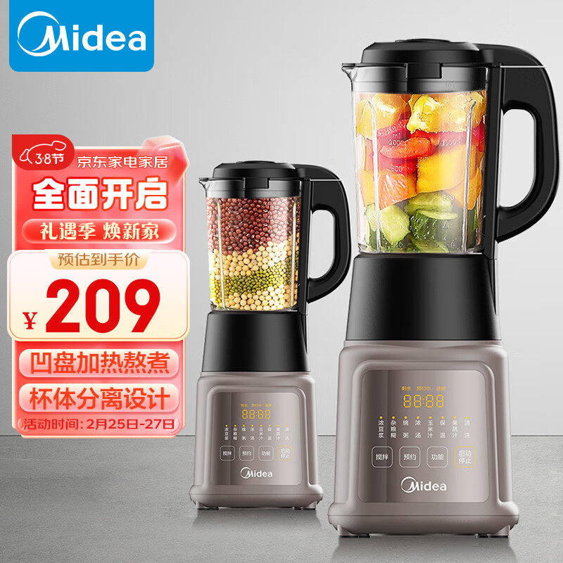 美的(Midea)破壁机1.2L家用多功能豆浆机冷热双打料理机婴儿辅食榨汁机MJ-PB6G2-021价格:209.00元!