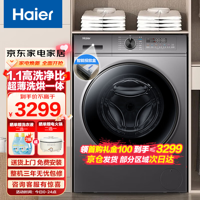 海尔(Haier)10KG全自动滚筒洗衣机家用大容量变频一级能效1.1高洗净比+洗烘一体XQG100-HBD1216[家电]价格:3399.00元!