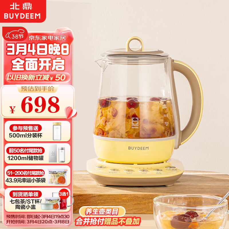 北鼎(Buydeem)养生壶中药壶多功能养生壶迷你玻璃煮茶器 煮茶壶花茶壶黑茶燕窝银耳K118小鹅黄价格:738.00元!