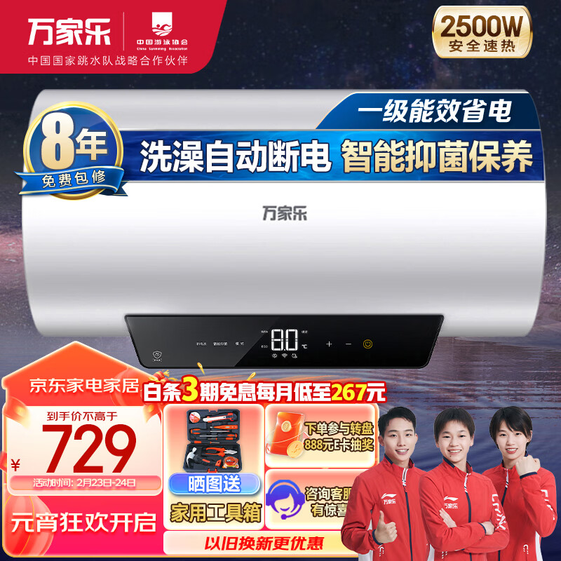 万家乐电热水器50升 储水式一级能效2500W速热 出水自动断电 智能保养手机智控D50-FW2价格:729.00元!