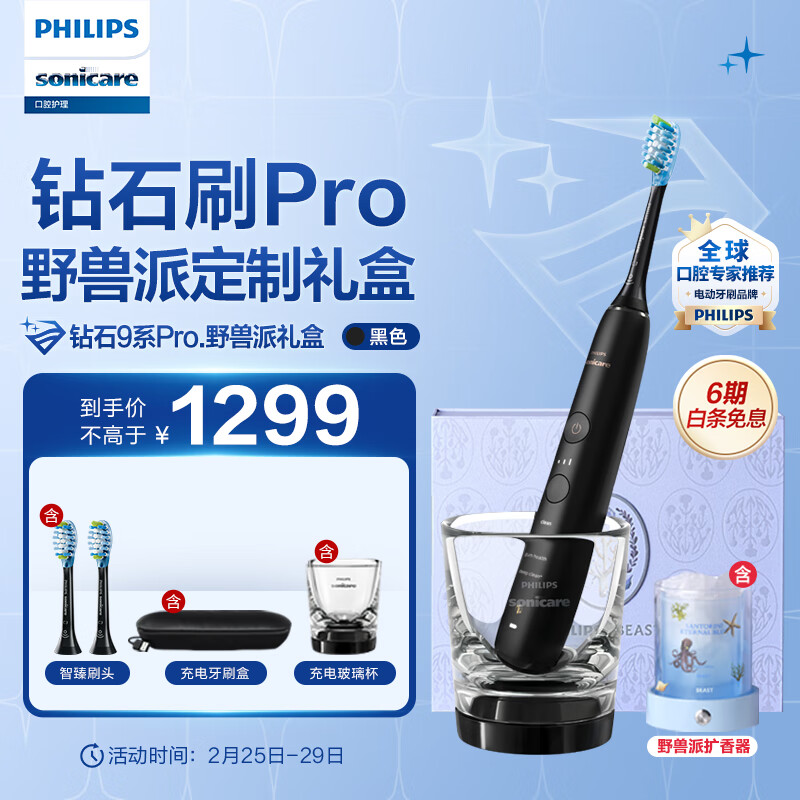 飞利浦(PHILIPS)电动牙刷成人 送女友/男友 10倍清除牙菌斑 2支刷头 钻石9系Pro野兽派礼盒 黑色价格:1459.00元!
