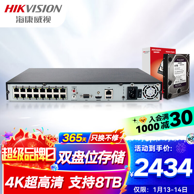 HIKVISION海康威视网络硬盘录像机监控POE网线供电满配16个摄像头带4T硬盘DS-7816N-Q2/16P价格:2594.00元!