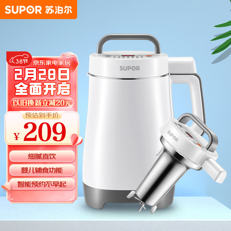 苏泊尔(SUPOR)豆浆机1.2L家用多功能 破壁免滤2-3人食多功能可预约搅拌榨汁料理机DJ12B-P17E价格:209.00元!
