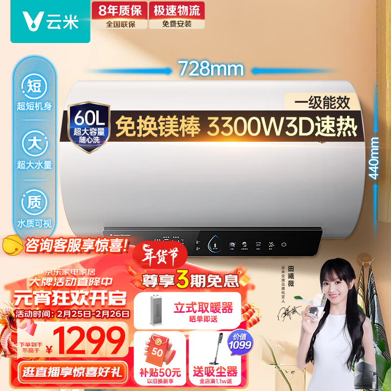 云米(VIOMI)电热水器60升3300W双管速热APP智控 一级能效节能省电双重防护VEW6029价格:1299.00元!