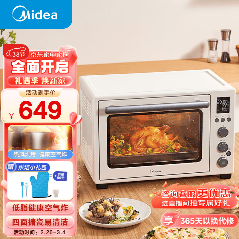 美的(Midea)40L大容量家用多功能风炉/四面搪瓷/旋转烤叉/热风循环/空气炸锅烤箱一体机 PT4012W(升级款)价格:629.00元!