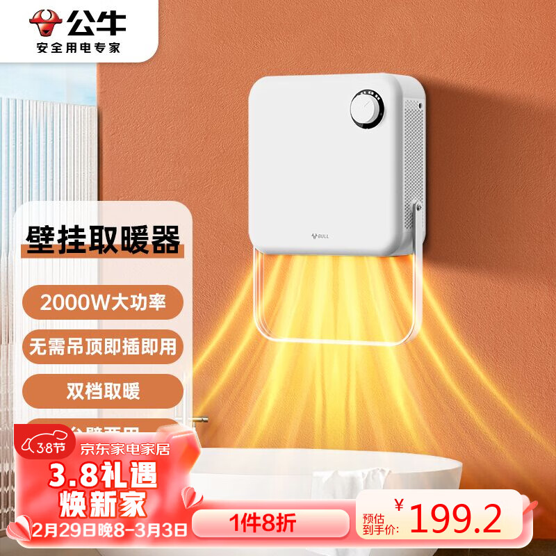 公牛(BULL)免打孔壁挂式风暖浴霸取暖器2000W暖风机移动便捷 GY15AJT价格:249.00元!