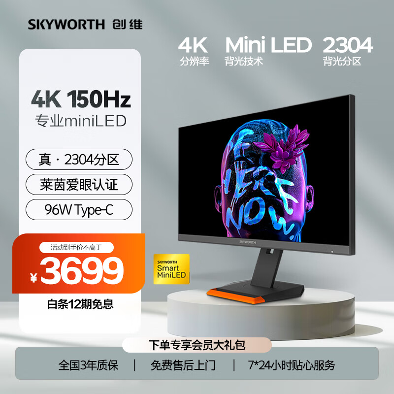 创维 27英寸 MiniLED显示器 4K 144Hz 150Hz 10.7亿色数 96W Type-C 2304分区 电竞显示器(F27G60U)价格:3999.00元!