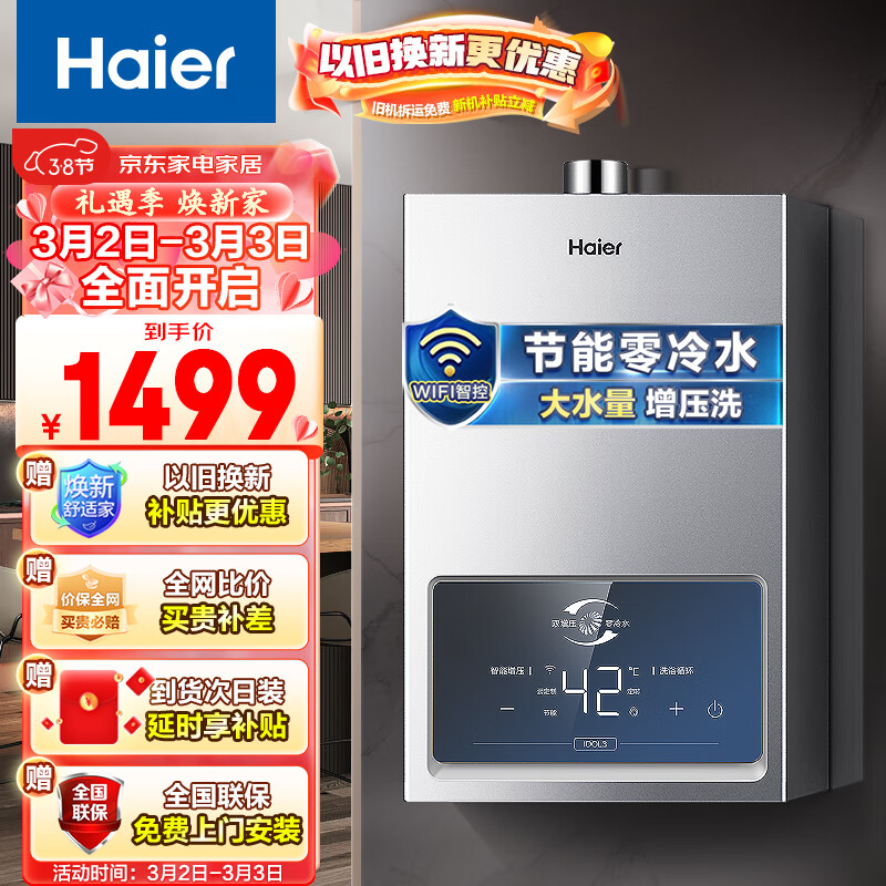 海尔(Haier)13升燃气热水器天然气大水量增压洗零冷水 AI自学习节能家用WIFI遥控智能防冻 JSQ25-13IDOL3-TU1价格:1699.00元!