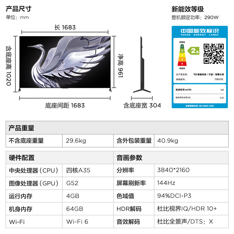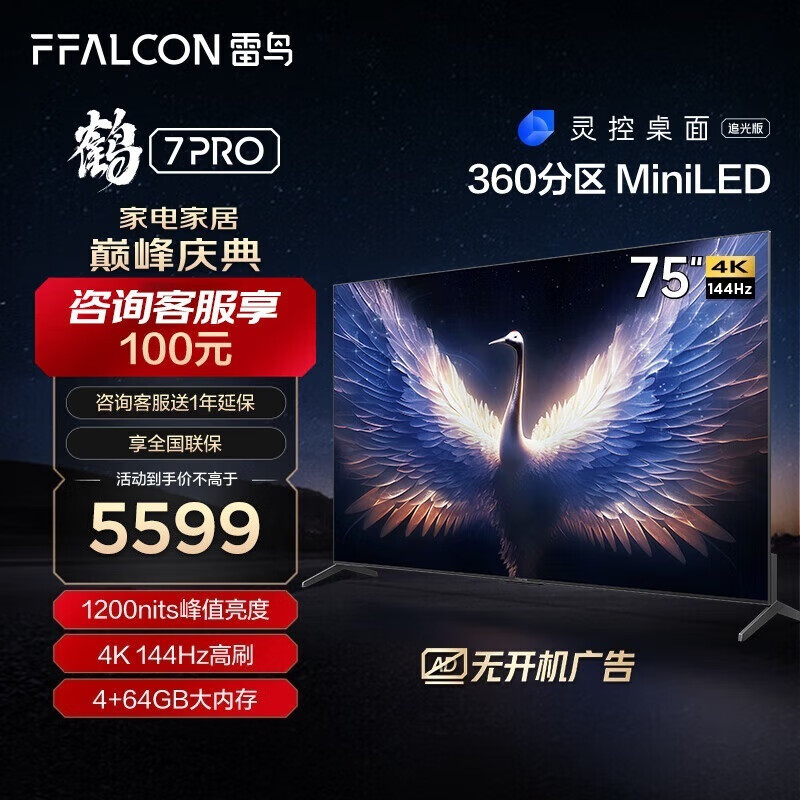 FFALCON雷鸟 MiniLED游戏电视75英寸鹤7Pro 144Hz高刷 4K超高清超薄智能液晶电视机75R675C[以旧换新]价格:5999.00元!