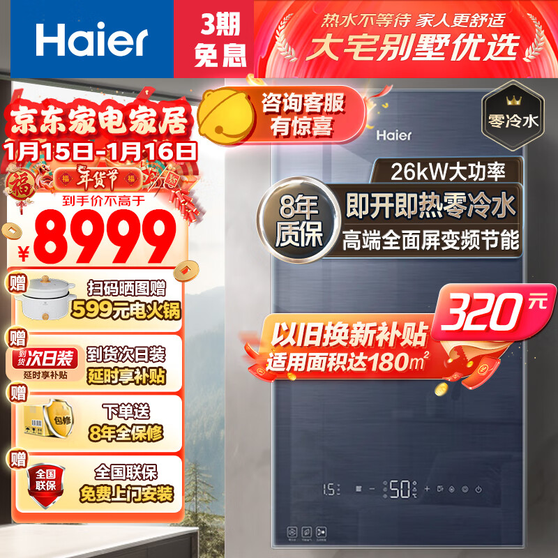 海尔(Haier)增压零冷水燃气壁挂炉天然气采暖炉热水器家用板换式地暖暖气片锅炉变频风机L1PB26-JR3(T)U1价格:8999.00元!
