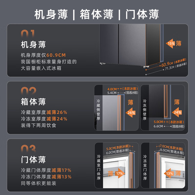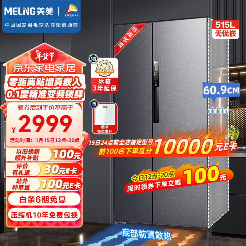 美菱(MeiLing)【无忧嵌】515升变频一级能效对开双开门冰箱家用风冷无霜净味超薄可嵌入式大容量BCD-515WPCZX灰价格:3299.00元!