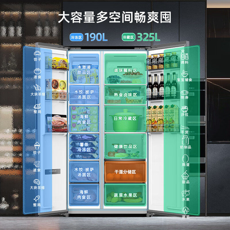 2、容量特别大,空间大,可以放很多东西,制冷效果非常好,风冷无霜,保鲜效果比之前的冰箱好很多,非常喜欢?