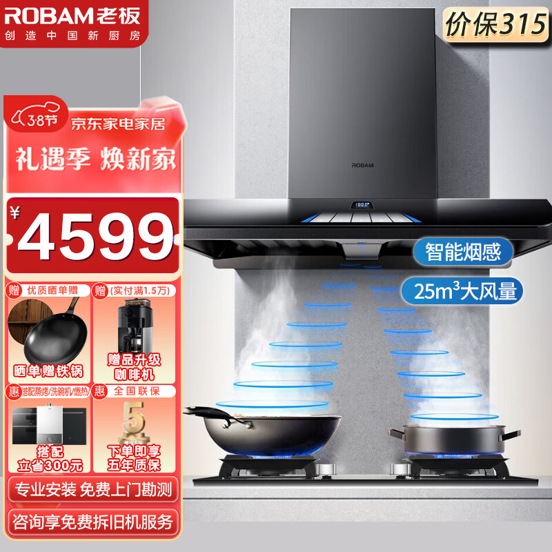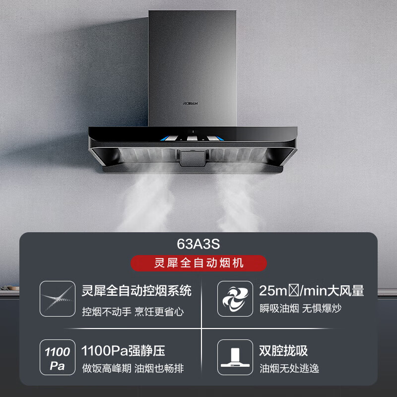 老板(Robam)灵犀全自动吸烟机 钢琴家欧式顶吸式双腔变频吸油烟机25大风量变频家用排油烟机63A3S价格:4599.00元!