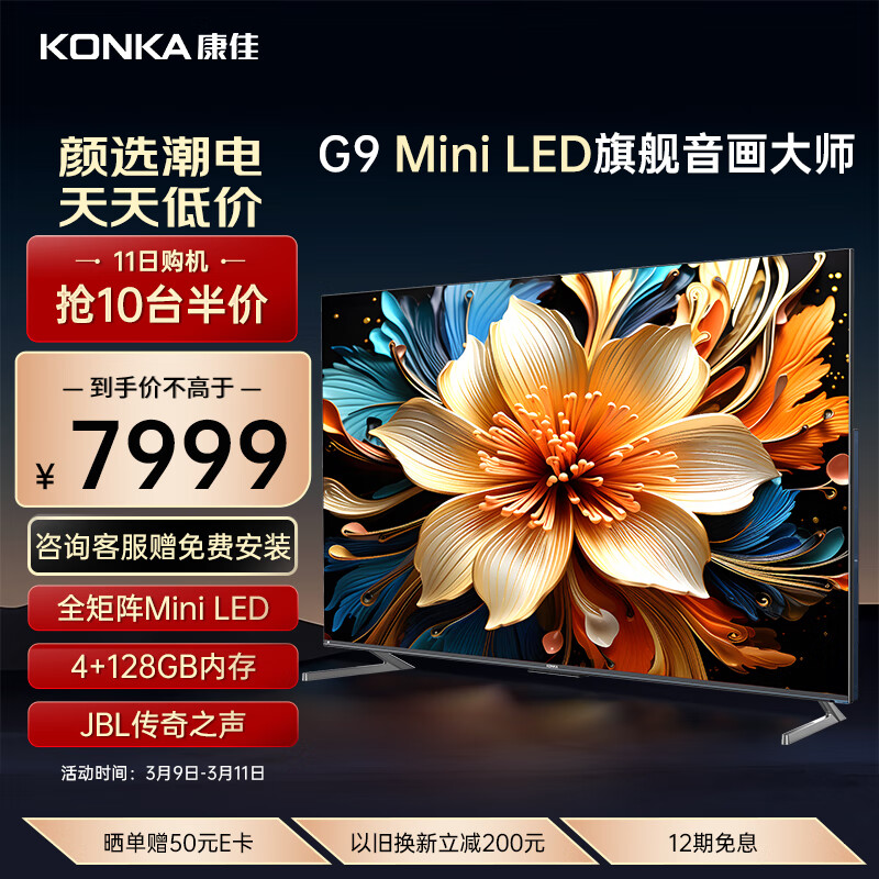 康佳电视 85G9 85英寸 Mini LED 144Hz 1200nits 4+128G 4K超清屏智能液晶平板游戏电视机以旧换新价格:7999.00元!