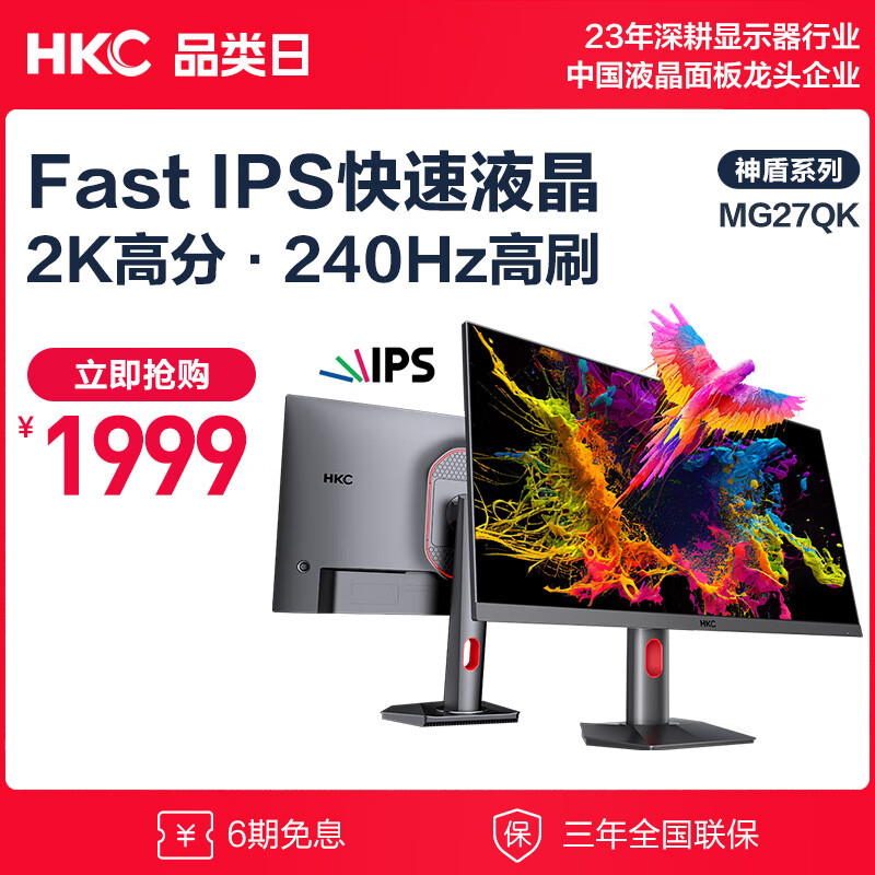 HKC 27英寸2K 240Hz FastIPS快速液晶 HDR600广色域 10Bit屏幕1ms升降旋转电竞游戏显示器 神盾MG27QK价格:2299.00元!