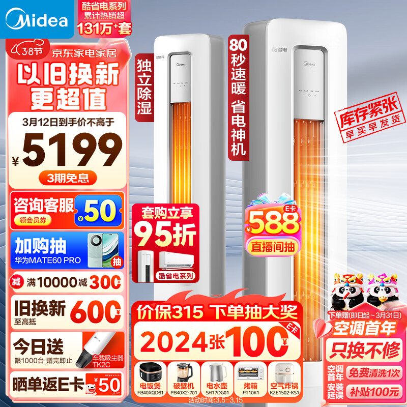 美的(Midea)空调 3匹 酷省电 三级能效 变频冷暖 空调立式 客厅空调柜机 智能家电 独立除湿 KFR-72LW/N8KS1-3价格:5199.00元!