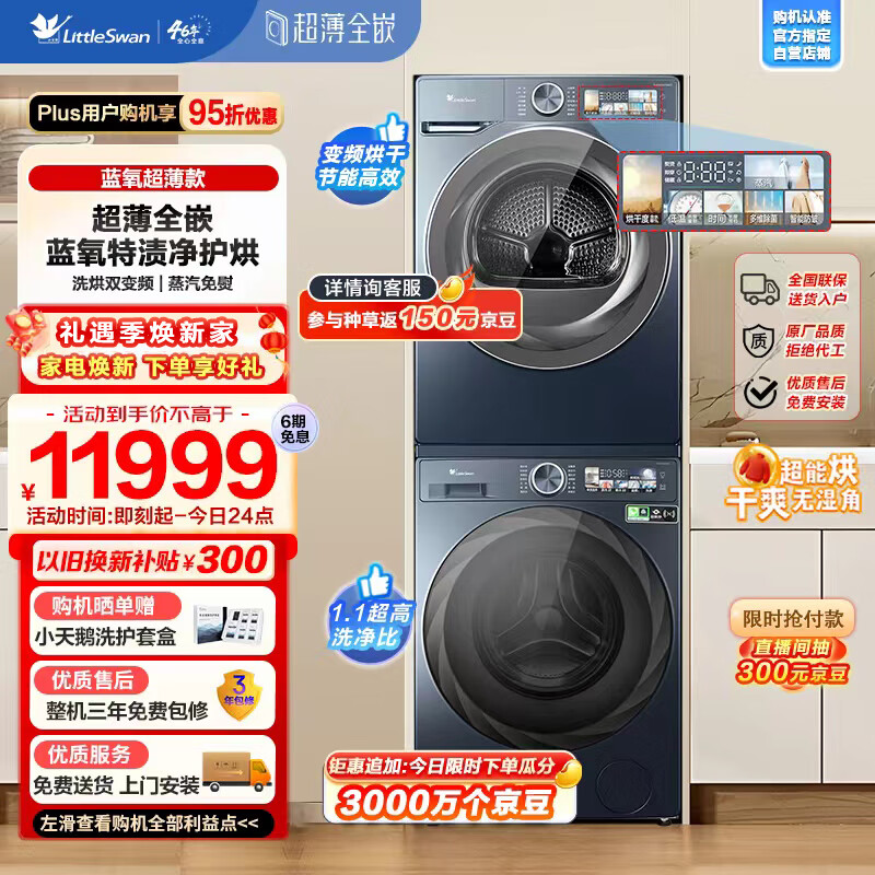小天鹅(LittleSwan)本色洗烘套装 10公斤滚筒洗衣机全自动+变频热泵烘干机家用 蓝氧特渍净 超薄全嵌TG100MS09LZ+QH19价格:11999.00元!