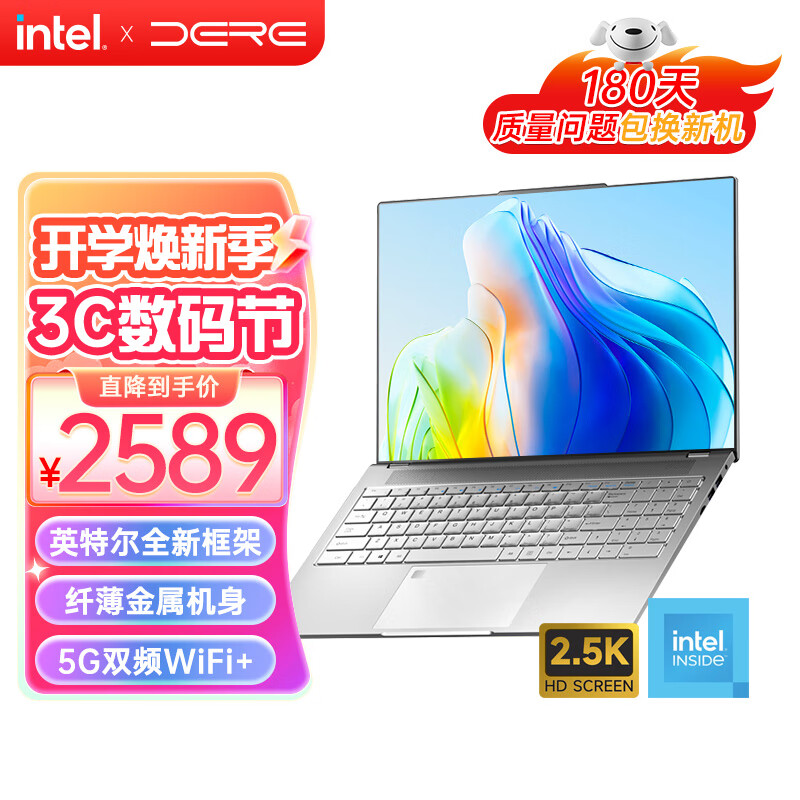 戴睿(dere)英特尔高颜值笔记本电脑16英寸2.5K高亮屏商务设计办公学生游戏手提轻薄金属本 16G+1TB 海豚银价格:2589.00元!