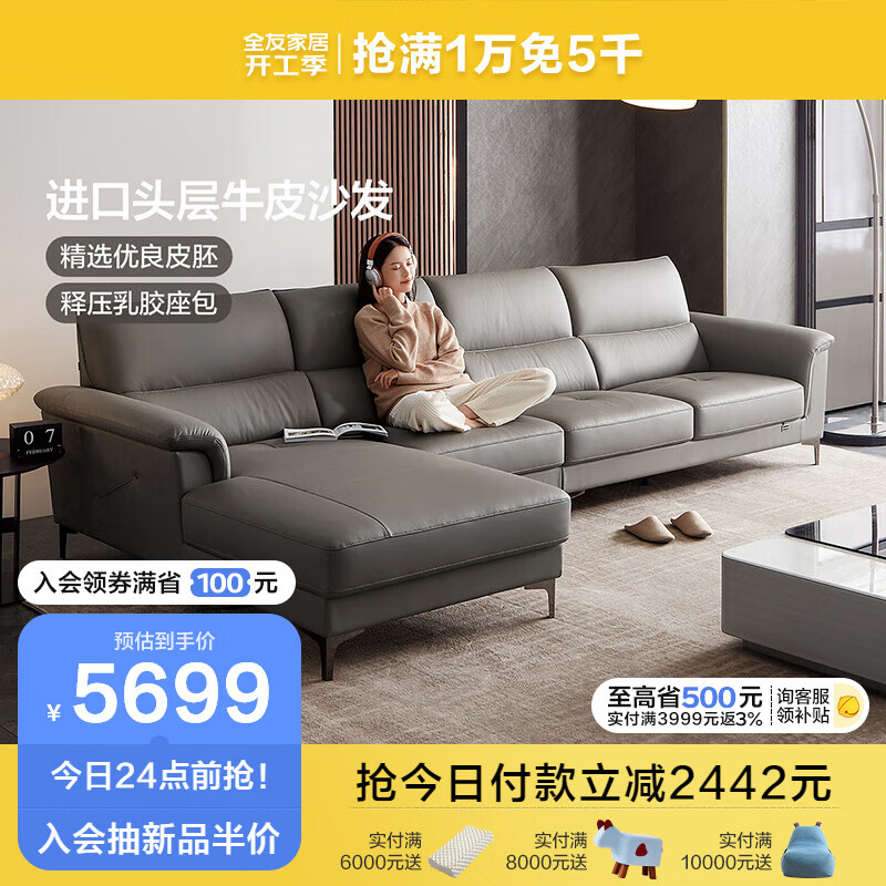 全友家居 皮沙发简约头层进口牛皮双层扶手乳胶座包客厅家具102728价格:8141.43元!