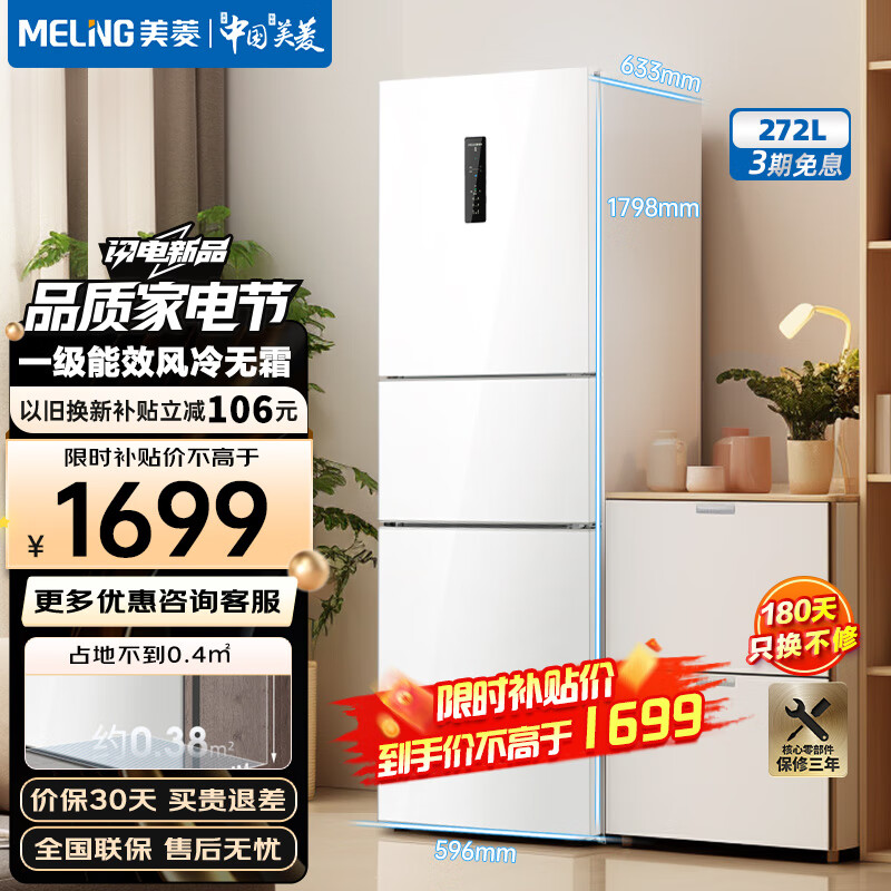 美菱(MeiLing)【离子净】272升三门小冰箱超薄嵌入一级能效变频小型家用大冷冻风冷无霜宿舍租房不串味迷你冰箱 BCD-272WP3CX 雪域白价格:1759.00元!