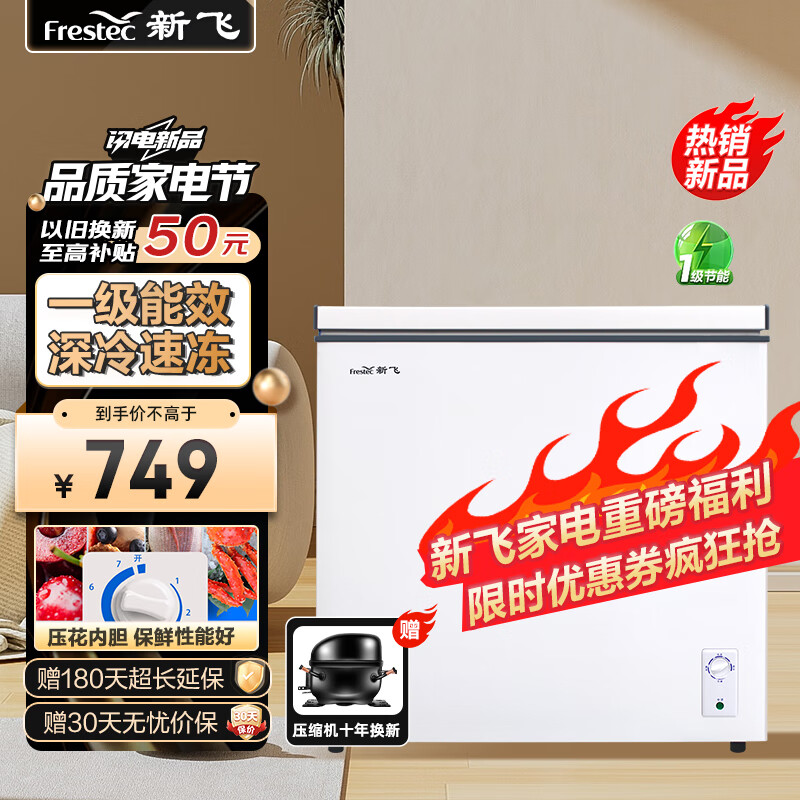 新飞(Frestec)201升冷藏冷冻转换一级能效家用商用变温冷柜卧式冰箱冰柜(白色)BC/BD-201KHAT价格:799.00元!