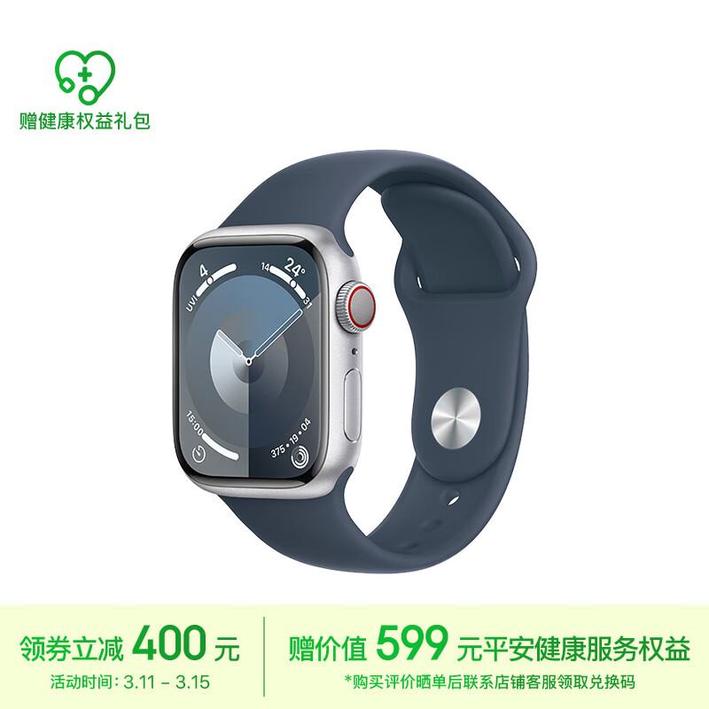 Apple/苹果 Watch Series 9 智能手表GPS+蜂窝款41毫米银色铝金属表壳风暴蓝色运动型表带S/M MRJL3CH/A价格:3699.00元!
