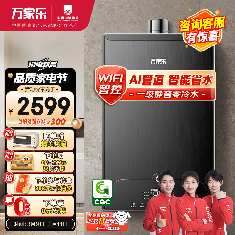 万家乐16升家用燃气热水器天然气一级静音恒温增压零冷水wifi智控防冻JSQ30-16RL10价格:2599.00元!