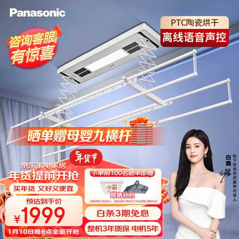 松下(Panasonic)电动智能烘干风干语音超薄嵌入式隐形藏晾衣架LED照明声控晒杆机价格:2279.00元!