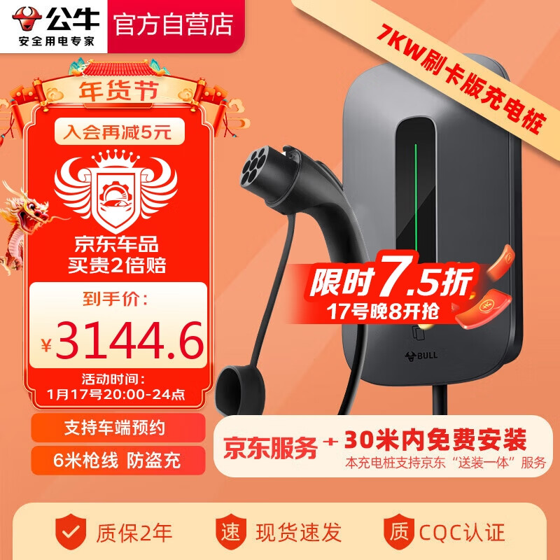 公牛新能源汽车交流充电桩适用比亚迪极氪蔚来小鹏吉利等 7KW-刷卡款 送装一体 30米内免费安装价格:4194.00元!