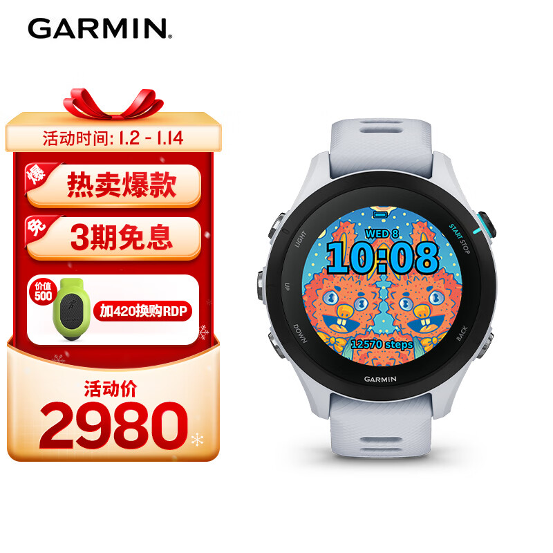 佳明(GARMIN)Forerunner255S音乐版纯净白心率血氧跑步铁三游泳户外运动手表价格:2980.00元!