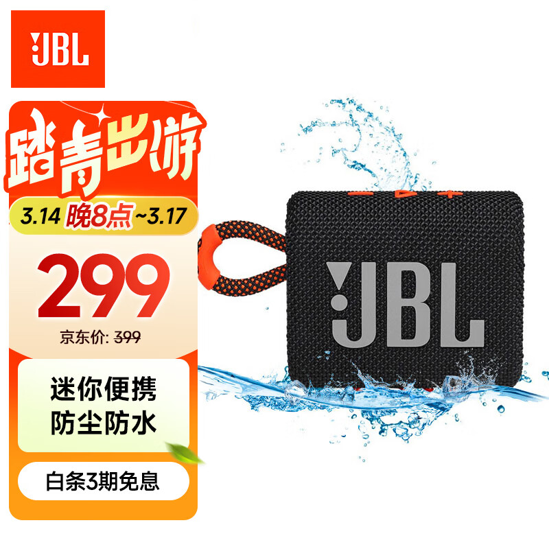 JBL GO3 音乐金砖三代 便携蓝牙音箱 低音炮 户外音箱 迷你音响 防水防尘 礼物音响 黑拼橙色价格:299.00元!
