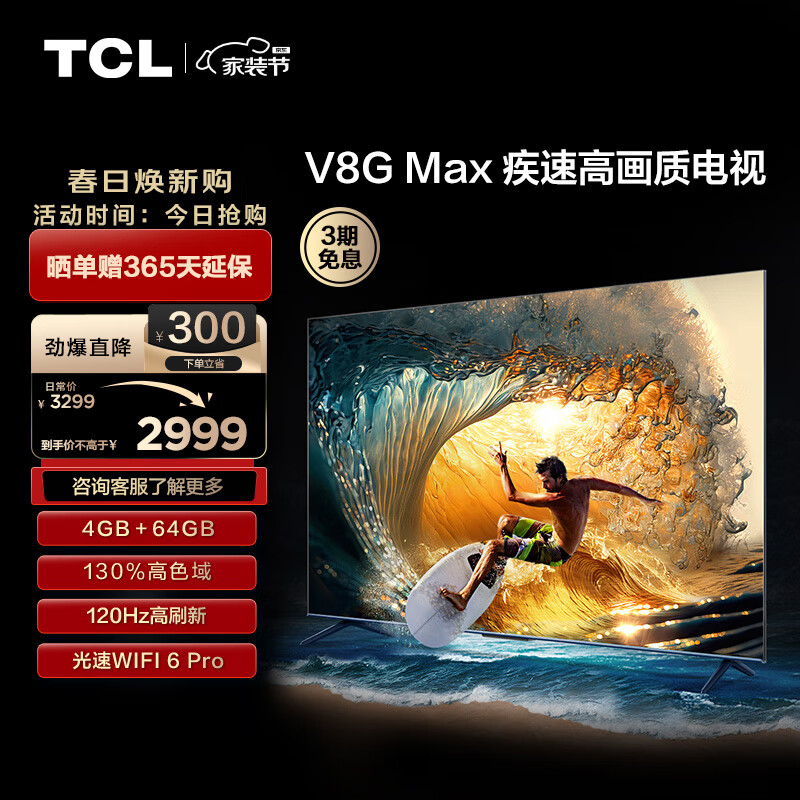 TCL电视 65V8G Max 65英寸 4+64GB 高色域 120Hz高刷 WiFi 6 Pro 4K超高清 客厅液晶智能平板电视机价格:2999.00元!