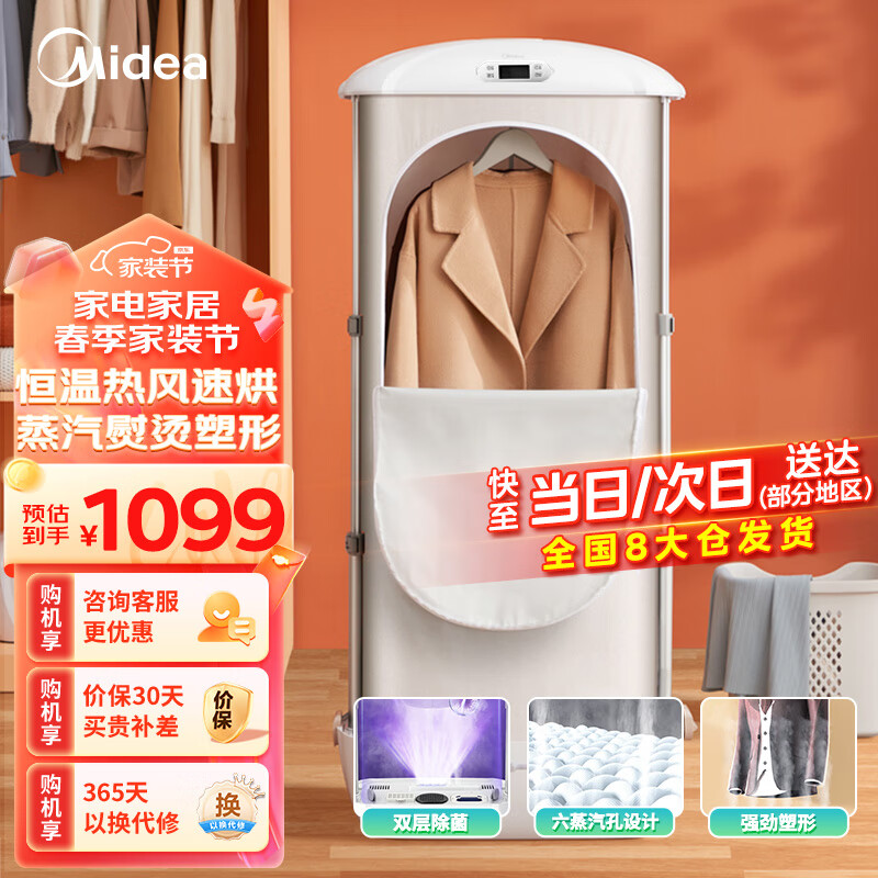 美的(Midea)衣物护理机 烘干机家用婴儿 全自动挂烫机 蒸汽熨烫除皱 高温杀菌香薰祛味 干衣机 MHJ90-01QUW价格:1099.00元!