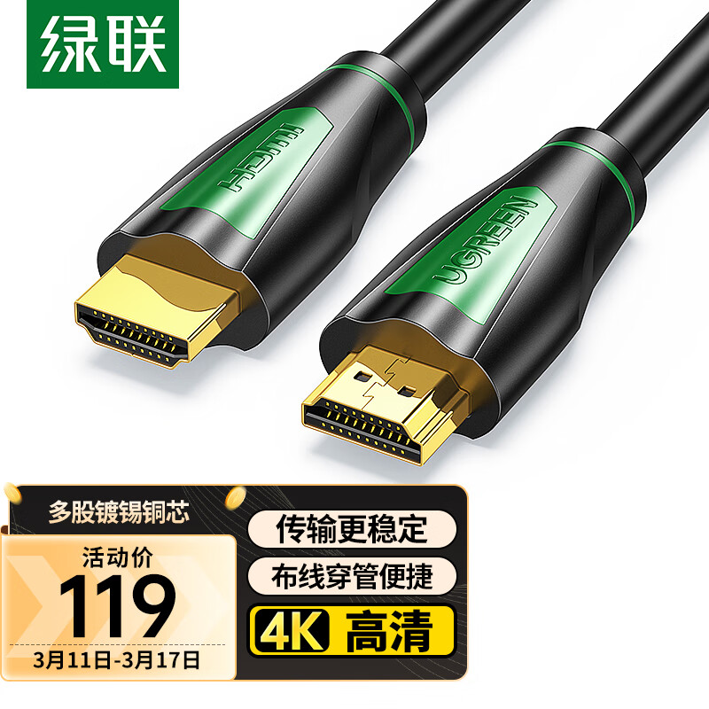 绿联HDMI线工程级 4K数字高清线3D视频线笔记本电脑机顶盒连接电视投影仪显示器数据连接线10米价格:119.00元!