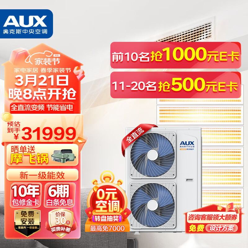 奥克斯(AUX)中央空调7匹一拖六家用多联风管机全直流一级变频包安装嵌入式空调适用五室一厅DLR-180W/DCJ2S-JM价格:31999.00元!