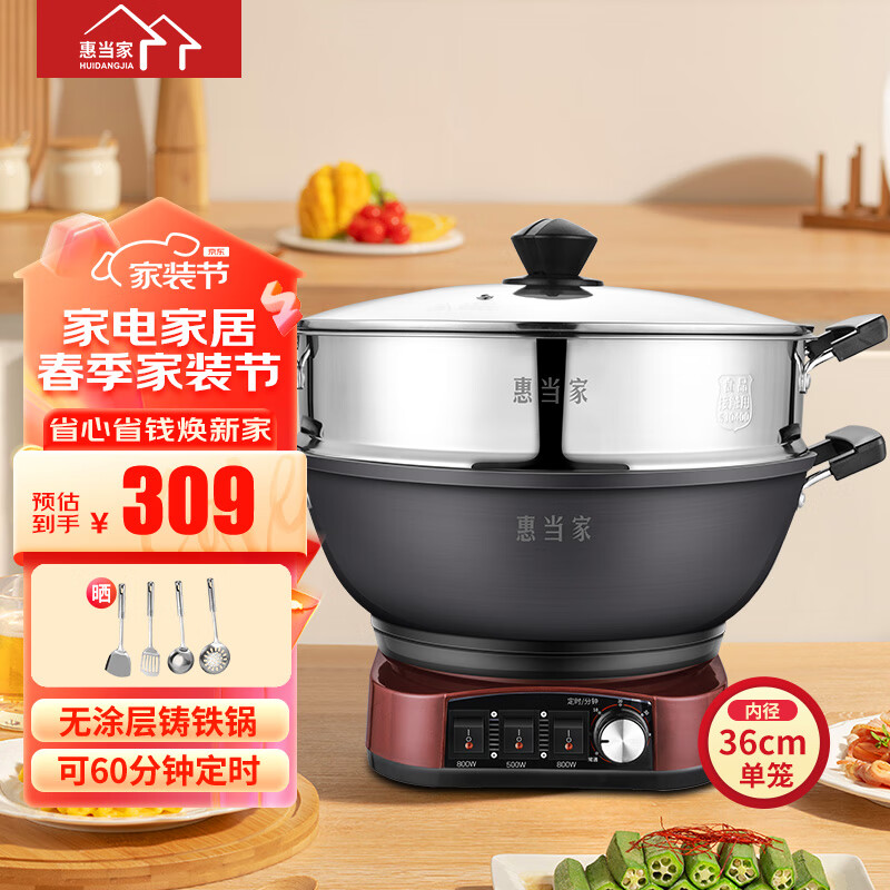 惠当家(Hui Dang Jia)电炒锅多功能电热锅电锅定时电蒸锅一体加厚铸铁锅电煮锅多用途锅 铸铁锅身-36cm单笼【定时款】 7L价格:328.00元!