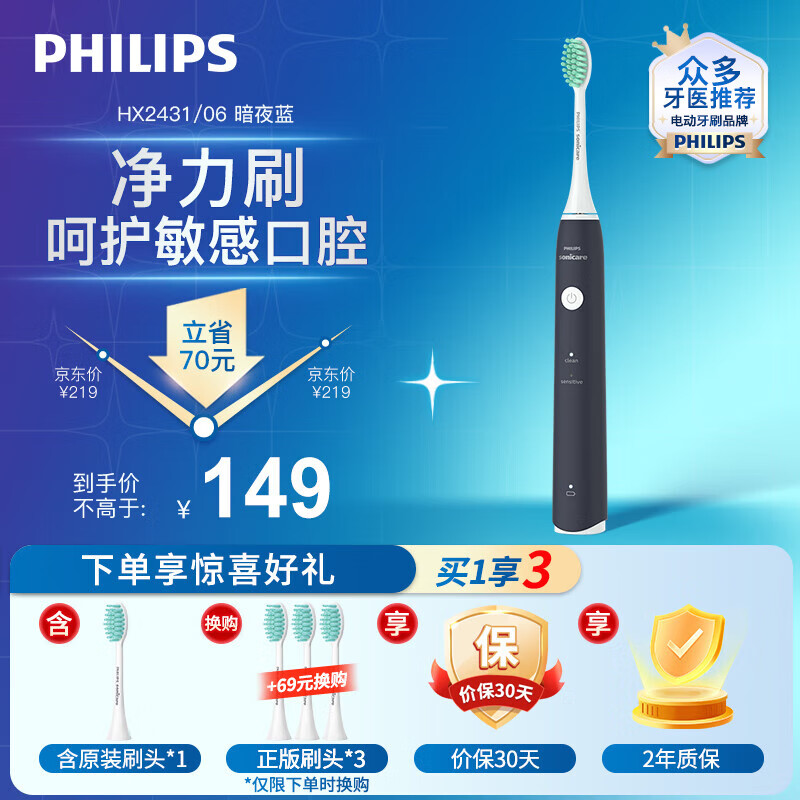 飞利浦(PHILIPS)电动牙刷成人 情侣款生日礼物送男友/女友 入门款 2种模式 洁齿护龈 净力刷 暗夜蓝价格:219.00元!