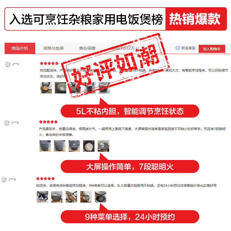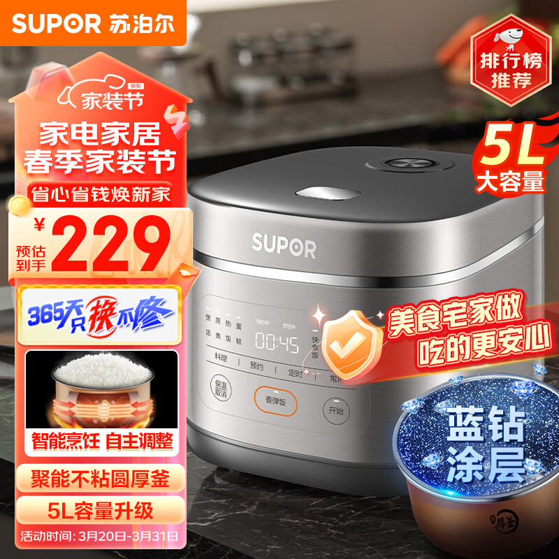 苏泊尔(SUPOR)电饭煲 电饭锅 5L大容量蓝钻圆厚釜家用多功能煮饭锅智能预约 快煮饭香弹饭 SF50FC0054价格:229.00元!