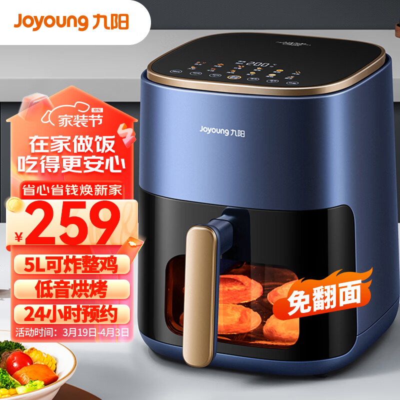 九阳(Joyoung)不用翻面 聚能寰顶 可视智能 远红外烘烤不用翻面空气炸锅 家用5L大容量 薯条机电炸锅 KL50-V552价格:259.00元!