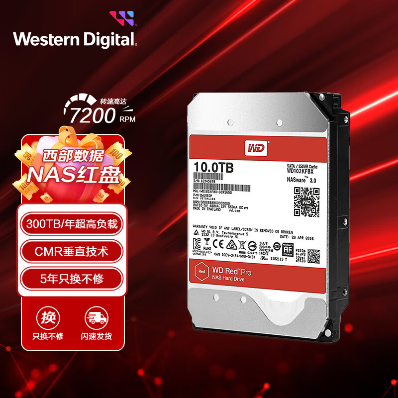 西部数据 NAS硬盘 WD Red Pro 西数红盘Pro 10TB CMR 7200转 256MB SATA 网络存储 私有云常备(WD102KFBX)价格:2499.00元!