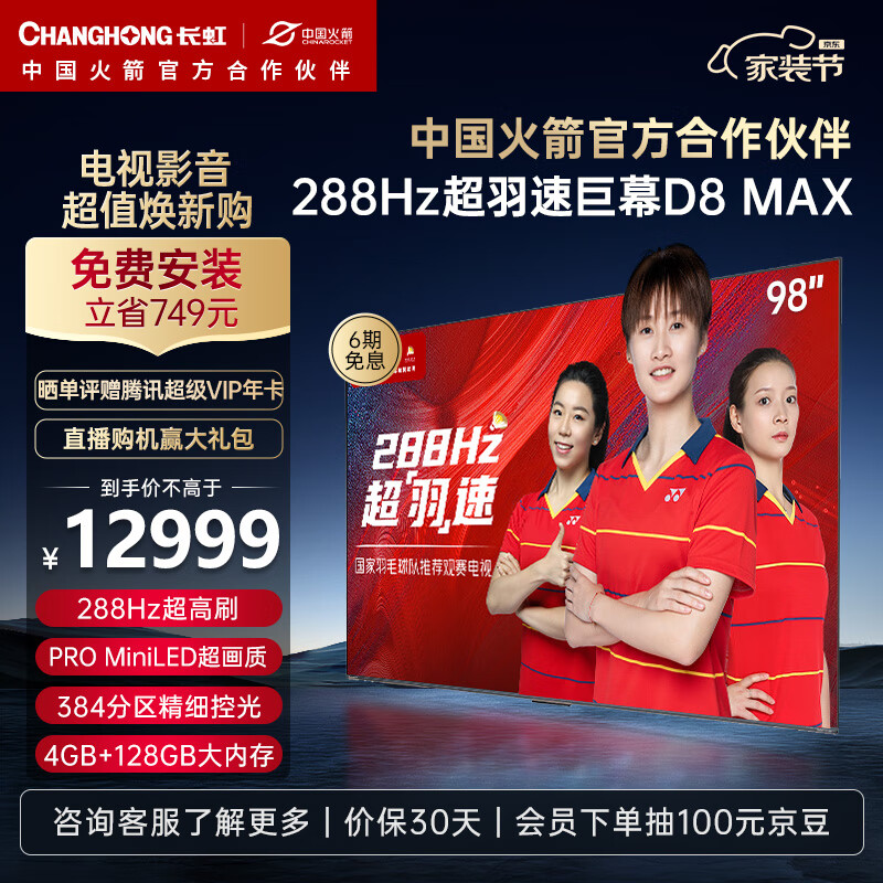 长虹电视98D8 MAX 98英寸288Hz超羽速巨幕MiniLED 1000nit 4+128GB 大屏智能平板液晶电视机 以旧换新价格:12999.00元!