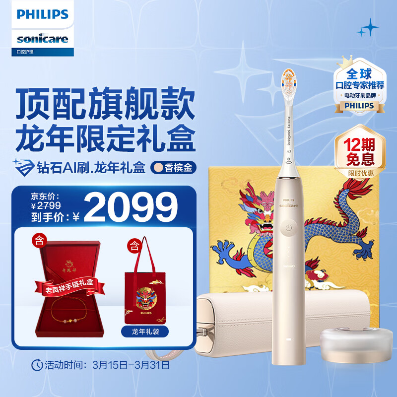 飞利浦(PHILIPS)电动牙刷含皮质充电旅行盒 20倍清除牙菌斑 钻石AI刷 香槟金 龙年限定礼盒价格:2379.00元!